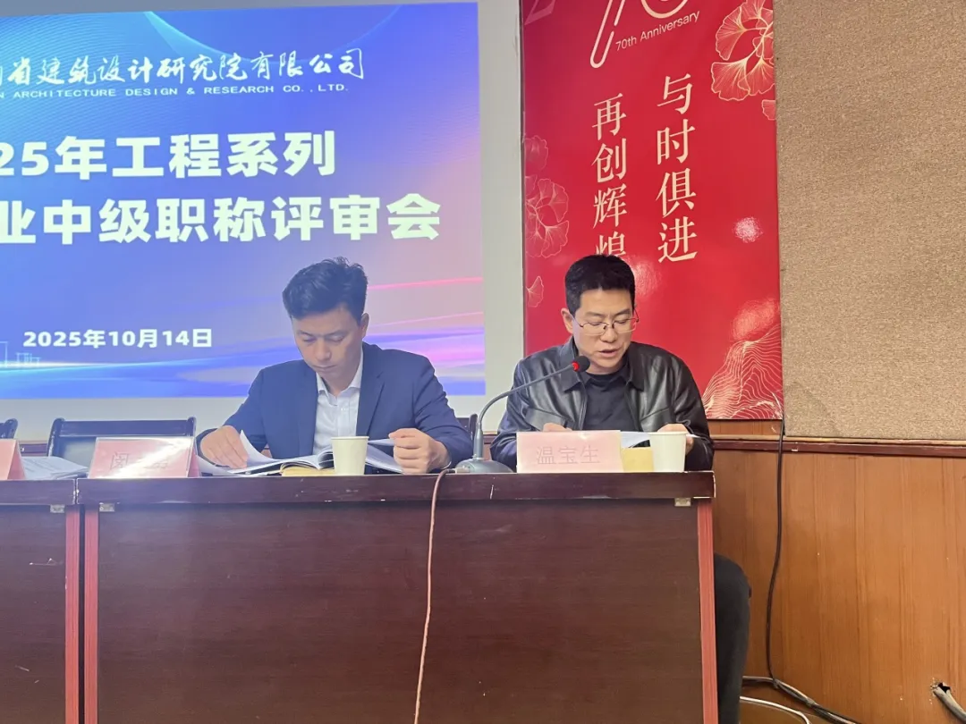 2025年10月14日,河南省建筑设计研究院有限公司2025年度工程系列建筑专业中级职称评审会议在公司报告厅顺利举行。公司党委书记、董事、财务总监韩兆海,党委委员、董事、副总经理、总工程师滕猛,董事、副总经理陈春强,以及来自公司和各相关领域的评审专家出席会议。郑州市人社局二级调研员娄渊胜、职称处处长闵勇、主任科员温宝生莅临指导。会议由人力资源部(党办)部长沈盈主持。