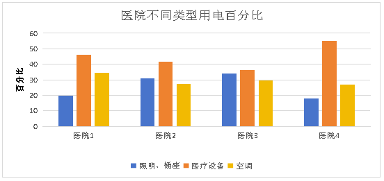 从以上数据可以看出,医疗建筑中照明用电量约占30-35%左右,动力用电占35-45%左右,空调用电占30-40%左右。