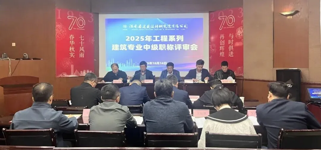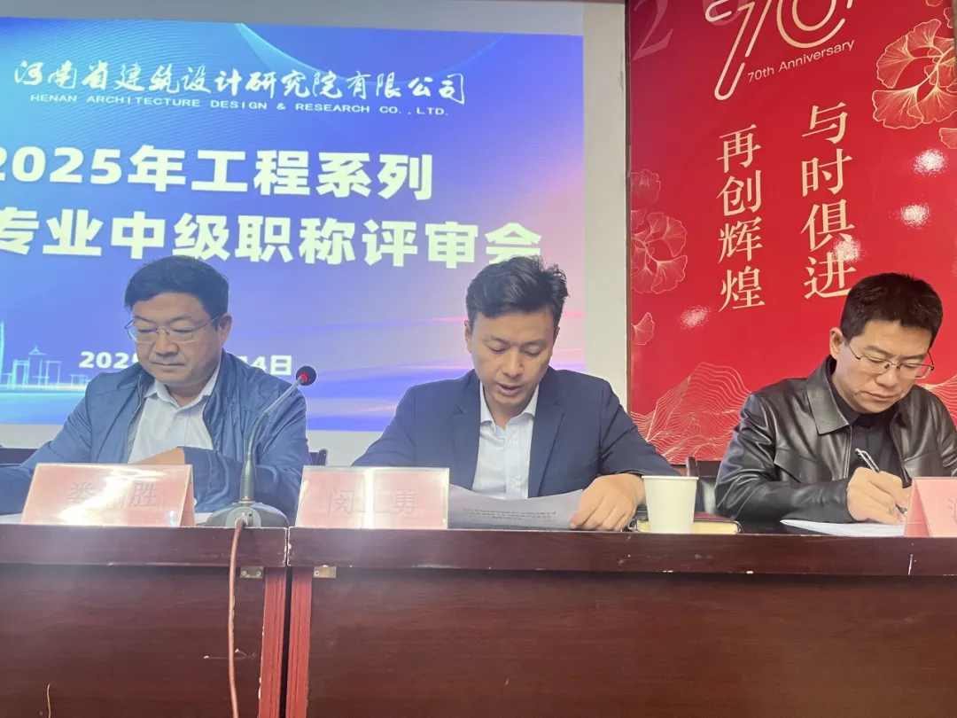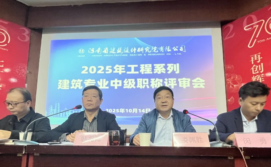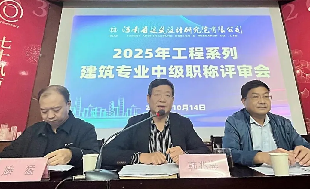 2025年10月14日,河南省建筑设计研究院有限公司2025年度工程系列建筑专业中级职称评审会议在公司报告厅顺利举行。公司党委书记、董事、财务总监韩兆海,党委委员、董事、副总经理、总工程师滕猛,董事、副总经理陈春强,以及来自公司和各相关领域的评审专家出席会议。郑州市人社局二级调研员娄渊胜、职称处处长闵勇、主任科员温宝生莅临指导。会议由人力资源部(党办)部长沈盈主持。