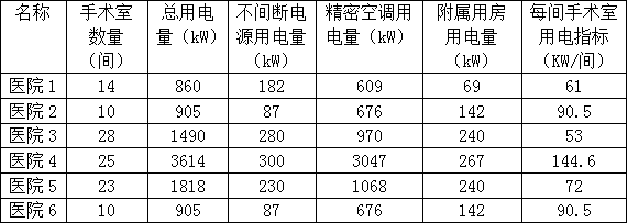 手术室总用电量可按70-90kW/间考虑,医院3、医院4、医院5手术室数量相近,空调用电差别大,空调设置方案对手术室用量影响较大。