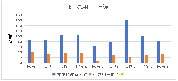 以上数据中,医院5空调采用直燃机,空调用电指标较低;医院7设置有制剂室且预留有二期用电量。正常情况下,医院建筑变压器容量时可按90-110VA/㎡计取。